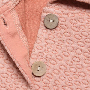 – Hàng cúc giữa được may chắc chắn với khuy cài bản to và mài nhẵn mềm mại, đảm bảo không gây bất kỳ tổn thương nào lên làn da của bé khi tiếp xúc. Hai bên cánh áo được đính kèm khuy bấm tiện lợi, giúp mẹ cố định áo cho bé để áo không bị tốc hay xô dịch mỗi khi ba mẹ bế bé hay khi bé đi ra ngoài.